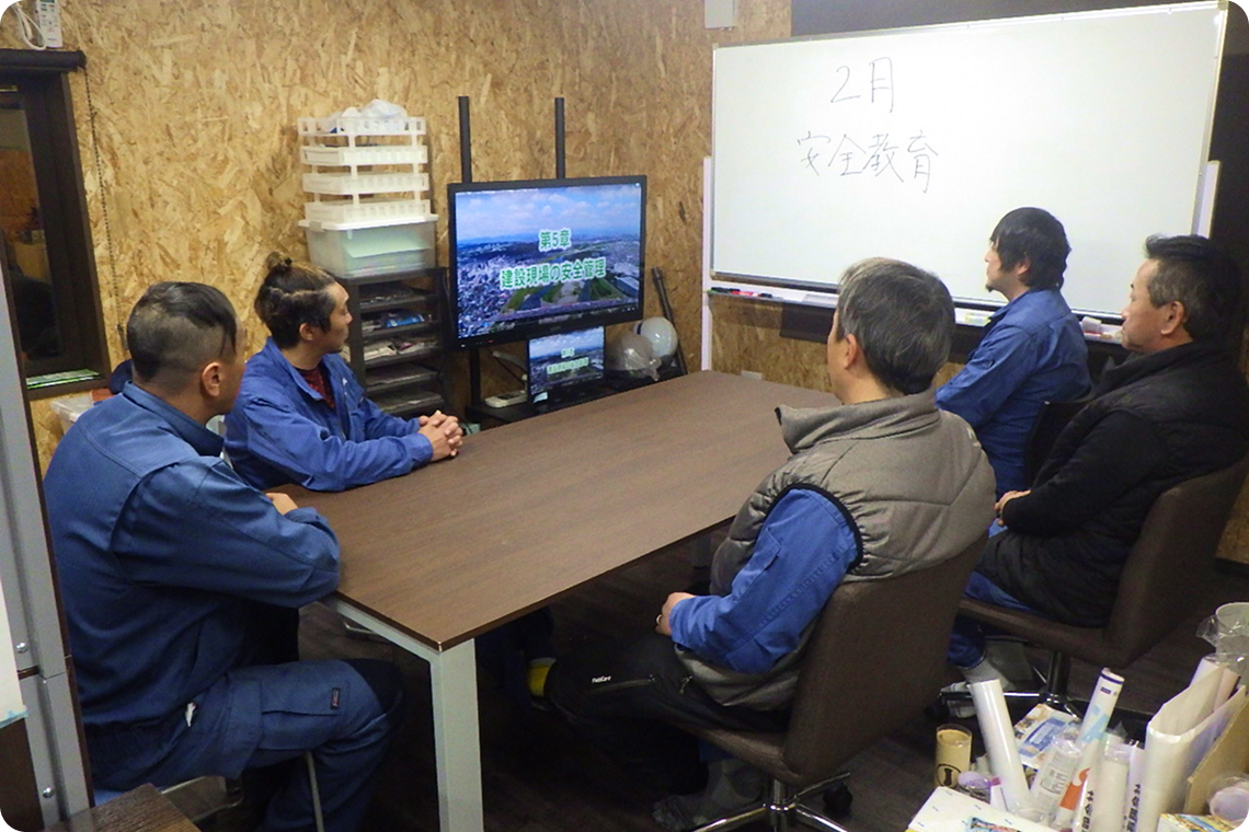 「安全第一」は当たり前。その先へ。日々の現場点検や(危険予知活動)を徹底し、無事故・無災害を基本目標としています。新人や若手社員には、経験豊富な先輩が現場で丁寧に指導を行い、実践的な教育体制が整っています。定期的な安全講習や外部研修の参加も推奨し、常に技術と意識の向上を図っています。